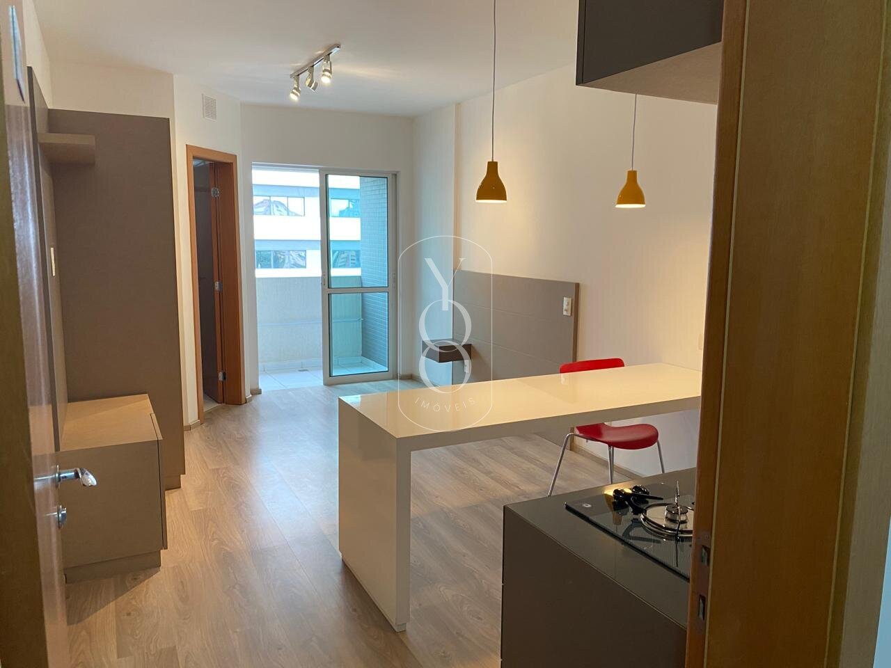 Studio mobiliado, andar alto, com ótima iluminação natural e planta funcional.