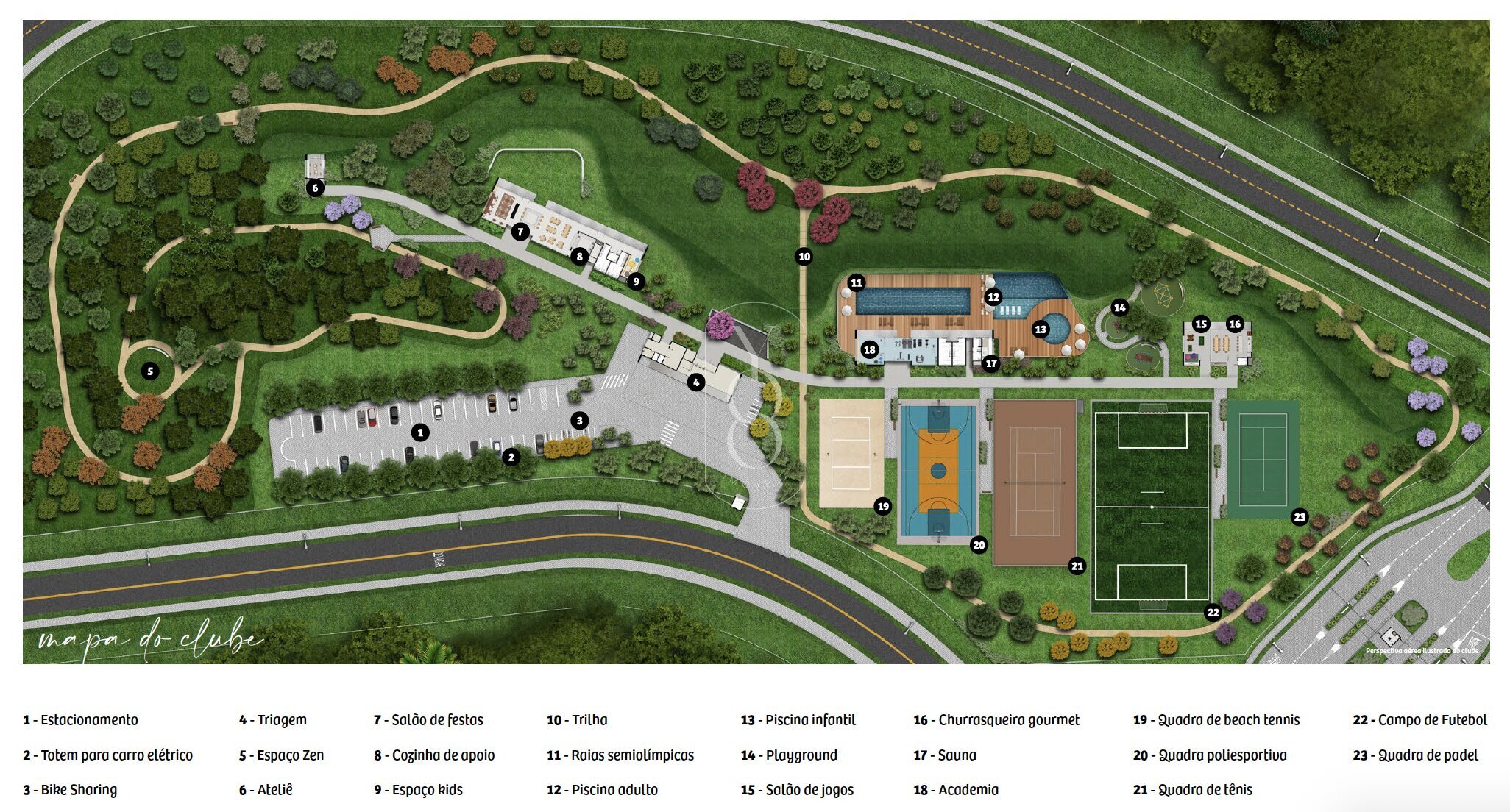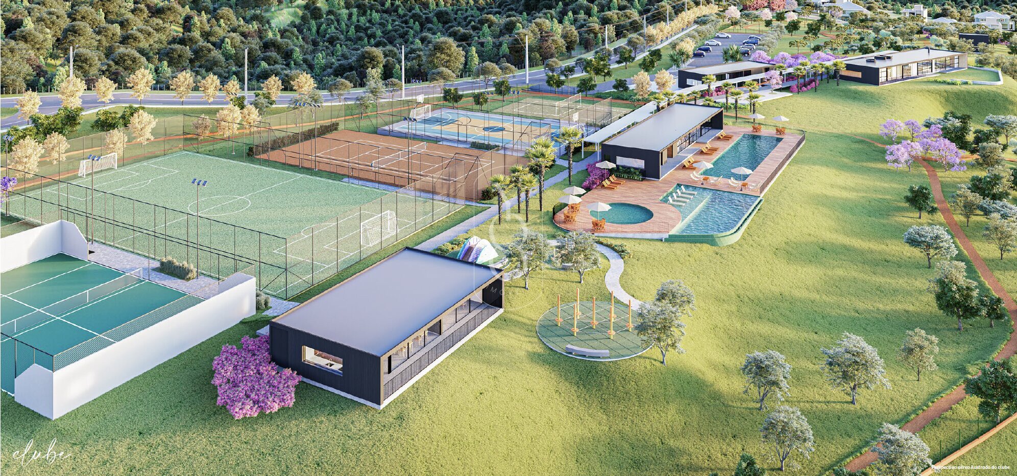• 5 quadras esportivas: beach tennis, poliesportiva, tênis, padel e futebol